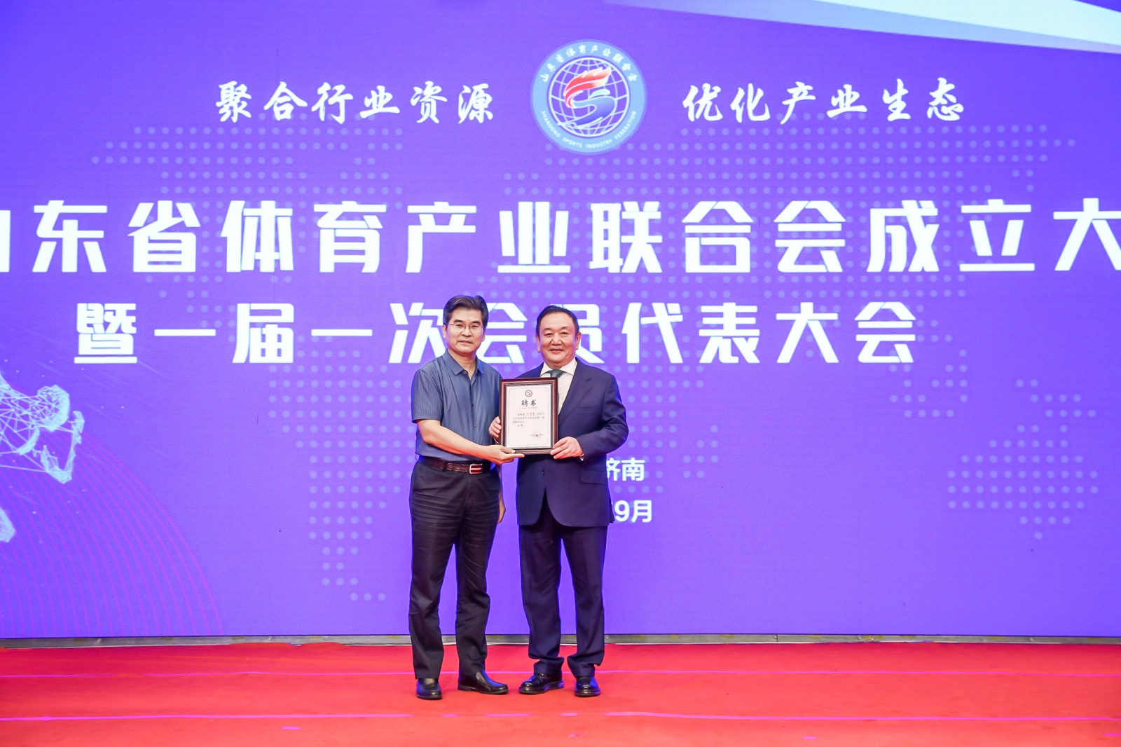 2020年9月16日,山東省體育產(chǎn)業(yè)聯(lián)合會成立大會暨一屆一次會員代表大會在山東濟南隆重召開。中國體育用品業(yè)聯(lián)合會主席李樺、山東省體育局副局長王延奎、中國文教體育用品協(xié)會副理事長張培生、中國體育用品業(yè)聯(lián)合會副主席兼秘書長羅杰、山東省民政廳社會組織管理局二級調(diào)研員王軍、山東省體育總會秘書處處長孫照亮、山東省體育局經(jīng)濟處處長徐金龍、山東省體育產(chǎn)業(yè)發(fā)展服務(wù)中心主任翟培建出席。山東省體育產(chǎn)業(yè)聯(lián)合會近200名會員單位代表以及部分省市媒體共同參加。全國政協(xié)委員、泰山體育產(chǎn)業(yè)集團(tuán)董事長卞志良當(dāng)選首屆理事會會長并發(fā)表講話。