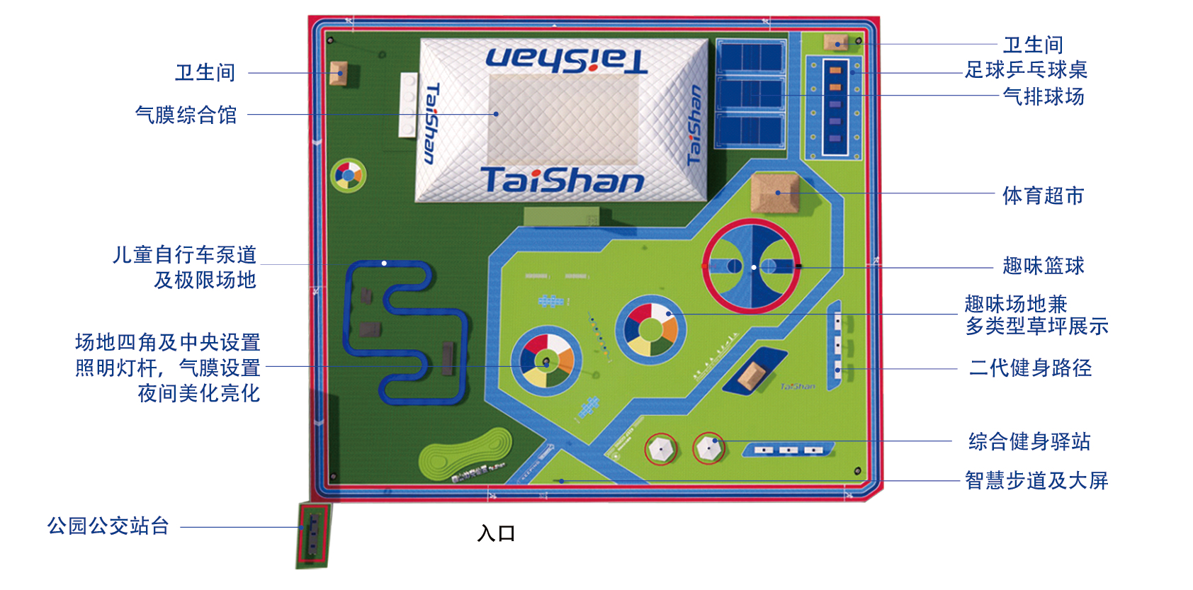 在場地鋪設(shè)上,均采用泰山新材料功能人造草鋪設(shè),全方位保證運動安全和環(huán)保;氣膜式籃球綜合運動館,內(nèi)部設(shè)置2片籃球場、6片乒乓球場地及1片網(wǎng)球場。網(wǎng)球場同時套線4個羽毛球場地。場館內(nèi)可以滿足體育運動,體育教學(xué)及群眾比賽需求。從場館到運動超市、智慧體測小屋,全部采用可裝配式建筑。
